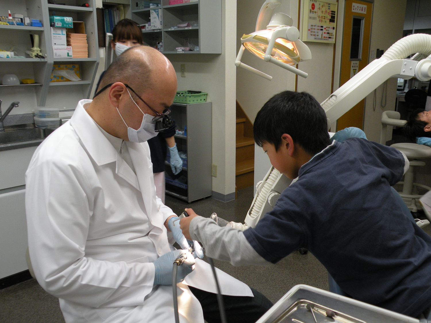 矯正治療手伝い Posted by Suetake 2011年2月20日 写真は1週間ほど前の治療風景です。矯正治療装置(バイオブロック)の調整をしているところですが、患者のお子さんとおしゃべりをしながら削っていると、自分から進んで削りかすをとばすためにエアー(風)をかけてくれる時があります。もちろん当院衛生士スタッフのように上手にはいきませんが、何とも楽しいひとときです。またお手伝いしてちょうだいね。