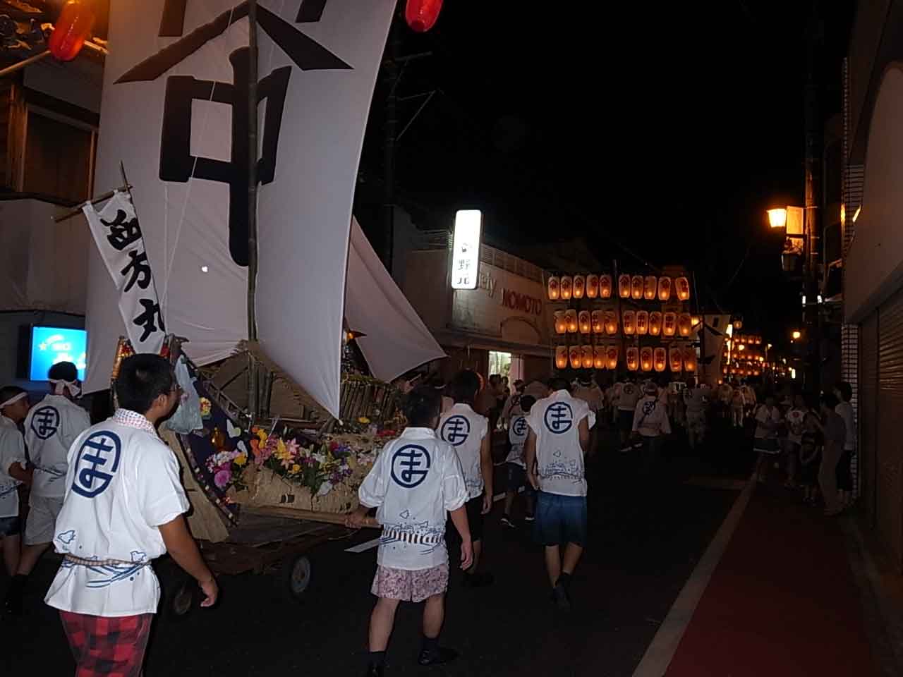 松浦太鼓は夕方と、夜には精霊船を先導する形で町を練り歩きます。