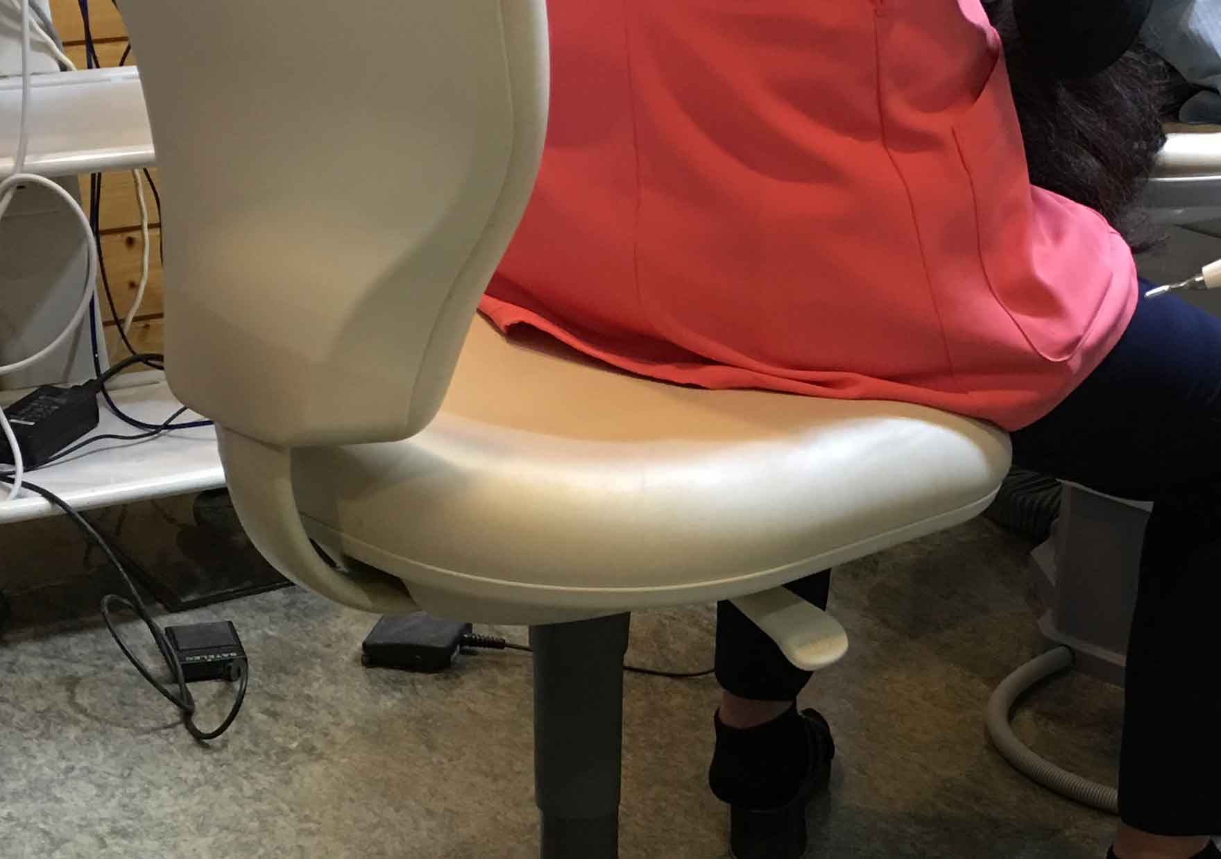 私をはじめとして、当院スタッフ全員がこのような座り方をしていて、少し前に体重がかかるような感じで治療をしている(マイクロスコープを使用する場合でも)ことを考えれば、後方にくぼみをつけて、明らかに体重が後ろにかかるようになるような形態が受け入れられるかどうか・・・